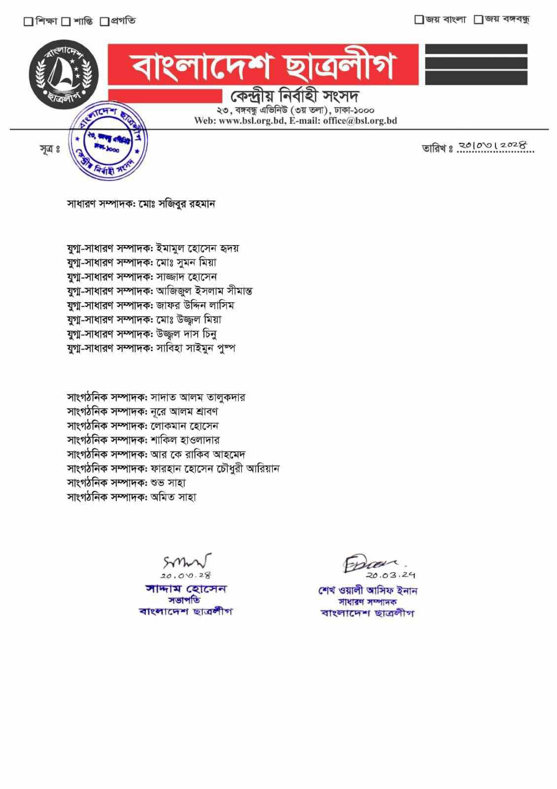 যুগ্ম সাধারণ সম্পাদক ইমামুল হোসেন হৃদয়, মো. সুমন মিয়া, সাজ্জাদ হোসেন, আজিজুল ইসলাম সীমান্ত, জাফর উদ্দিন লাসিম, মো. উজ্জ্বল মিয়া, উজ্জ্বল দাস চিনু ও সাবিহা সাইমুন পুষ্প।