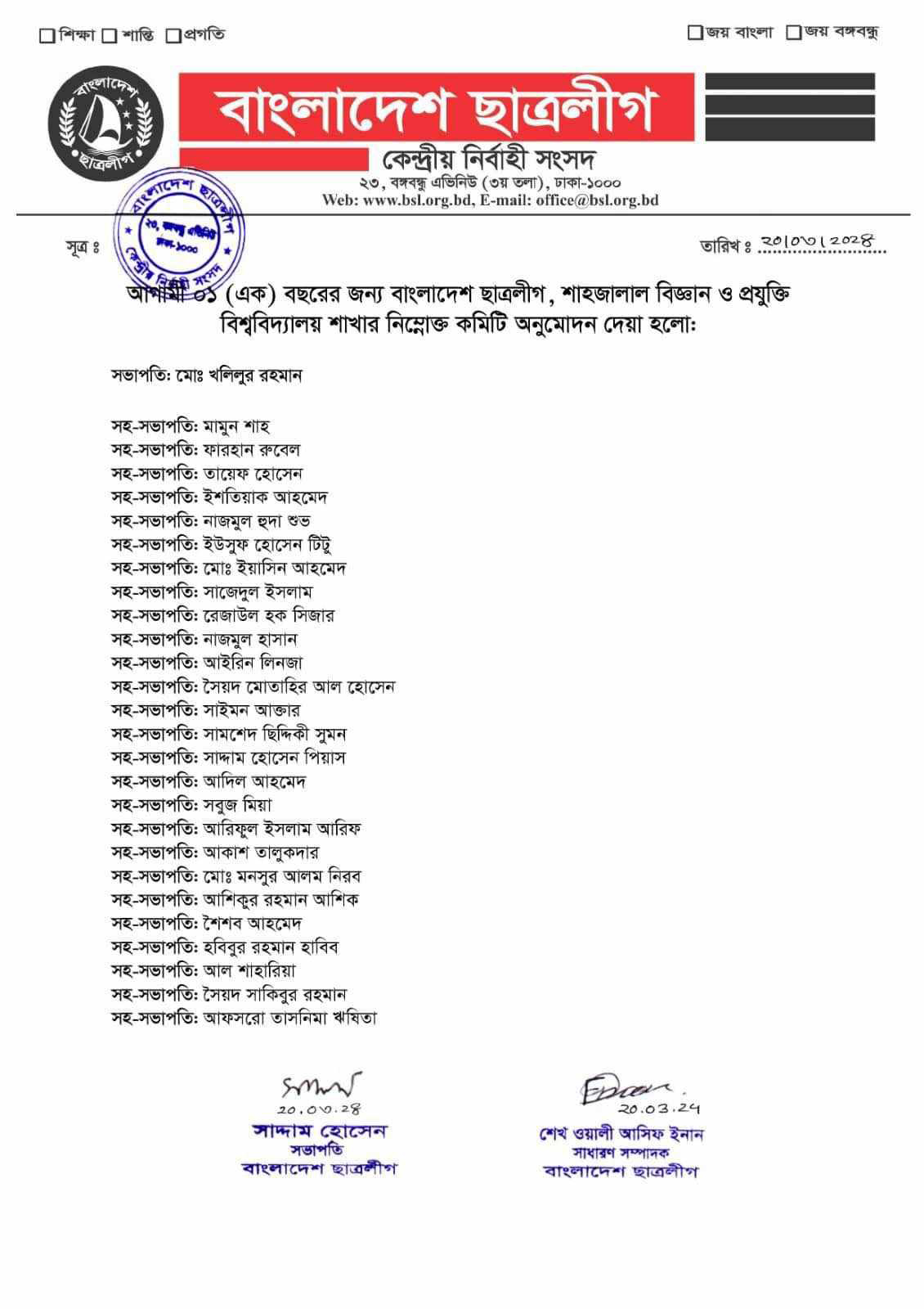 বাংলাদেশ ছাত্রলীগ শাহজালাল বিজ্ঞান ও প্রযুক্তি বিশ্ববিদ্যালয় শাখার নতুন কমিটি অনুমোদন দেয়া হয়েছে।